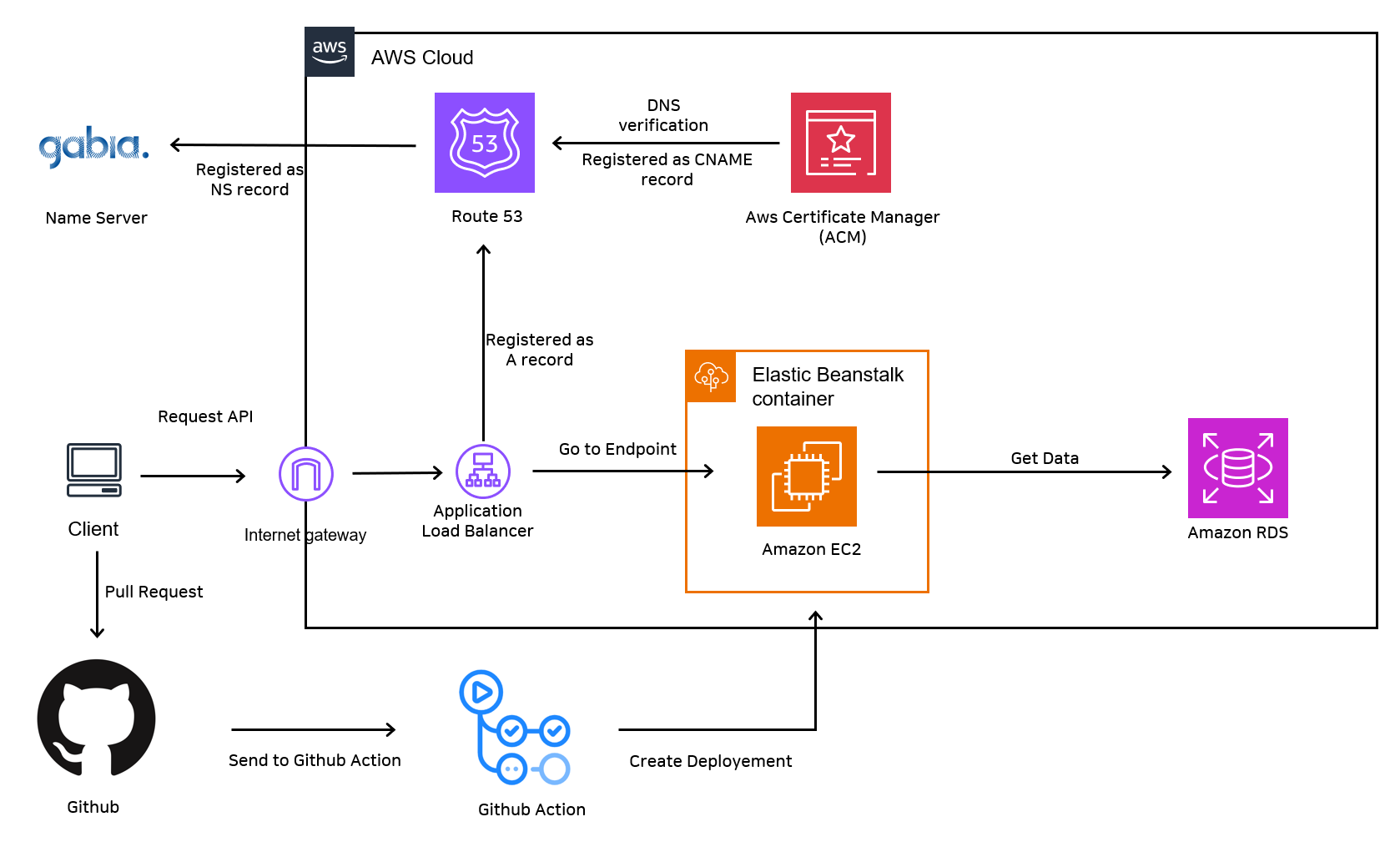Amazon Elastic Beanstalk + Amazon Route 53 + ACM + 가비아 + Github Actions(CI/CD) + Amazon RDS(MySQL)으로 백엔드 인프