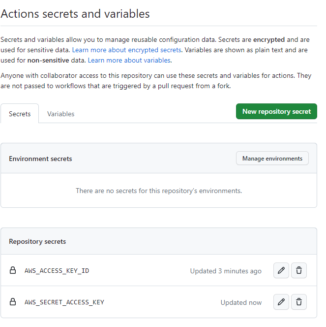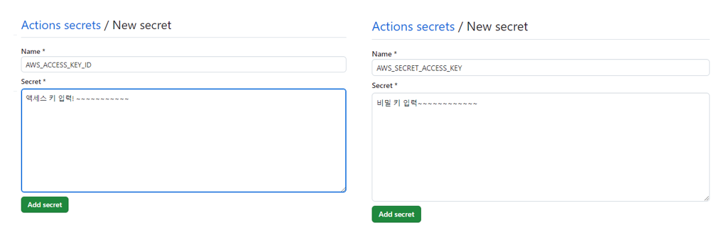 이제 github repository에 액세스 키와 비밀 키를 저장하자.