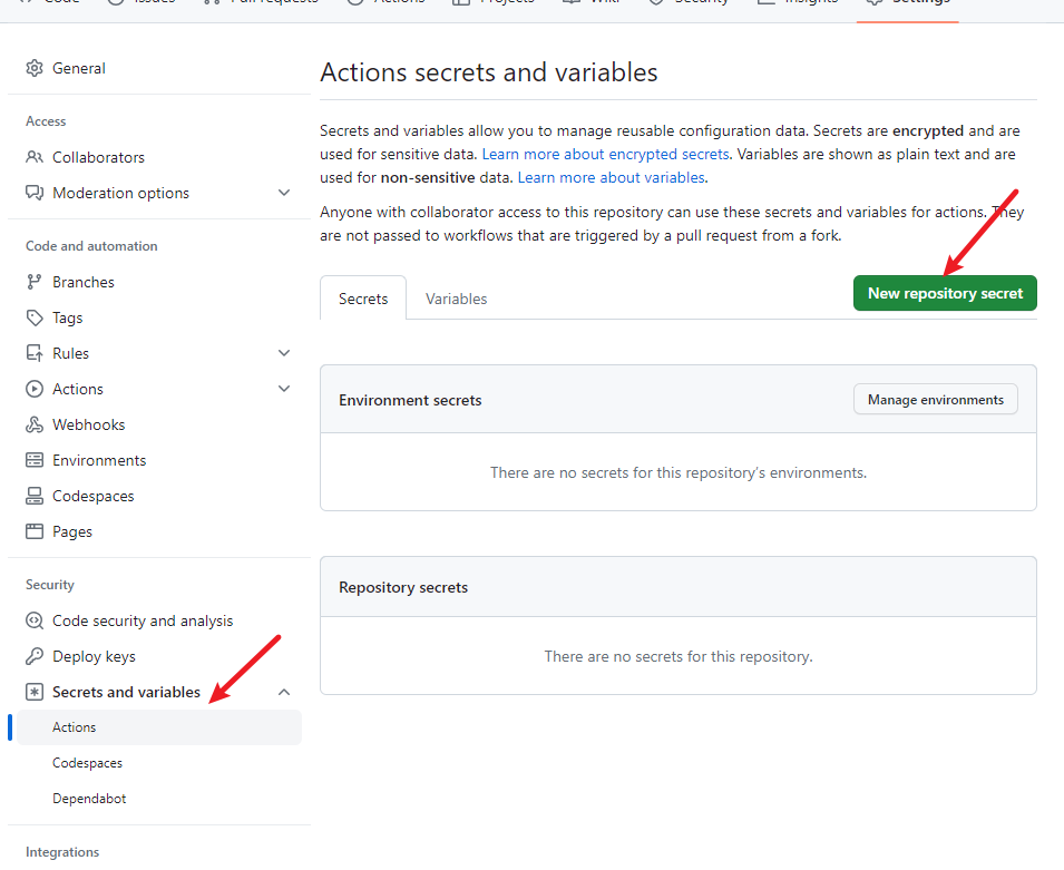 왼쪽 하단의 Secrets and variables를 클릭 후 New repository secret를 클릭하자.