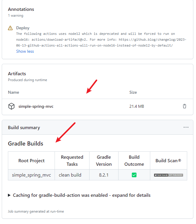 - actions/upload-artifact를 이용하여 이름은 simple-spring-mvc로 해당 path에 담긴 jar파일을 아티팩트로 업로드한다.