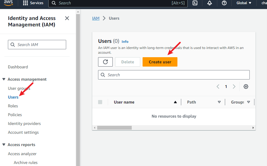 Access Management의 Users를 클릭한 후 Create user를 클릭하자.