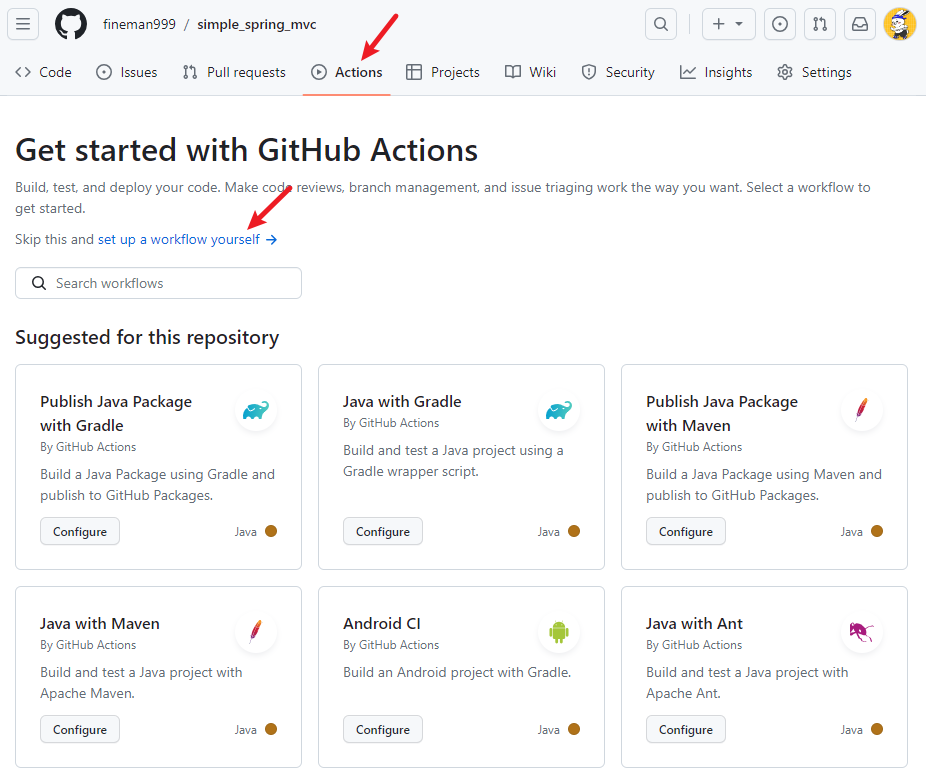 GitHub Repository에 들어가면 상단에 Actions가 있다. 클릭을 하면 다양한 Actions가 있는 것을 확인할 수 있다. 현재 사용하고 있는 프로젝트 토대로 Actions를 제안한다.