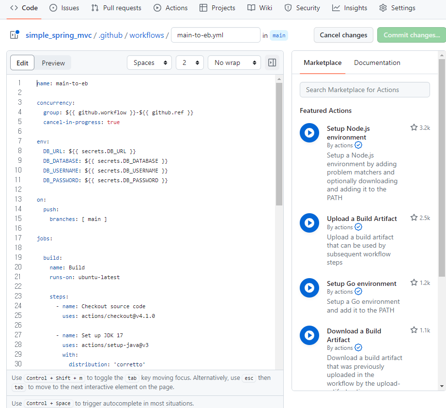 - einaregilsson/beanstlak-deploy 액션을 이용하여 Elastic Beanstalk 환경으로 애플리케이션을 배포할 수 있다.