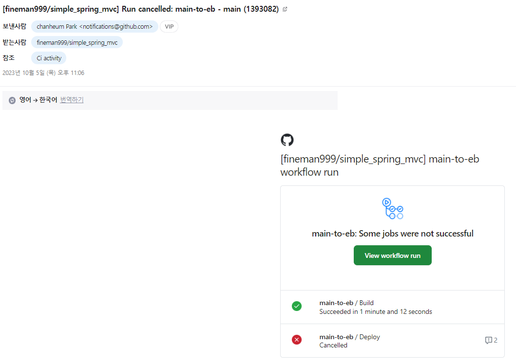 새로운 작업이 시작되면 깃허브에서 이메일로 이전에 실행 중인 작업을 중단하게 되었다는 걸 알린다.