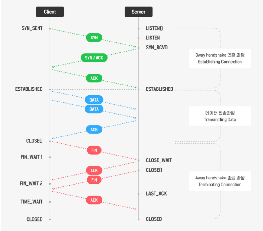 TCP 통신은 이 3-way handshake와 4-way handshake 과정을 거친다.