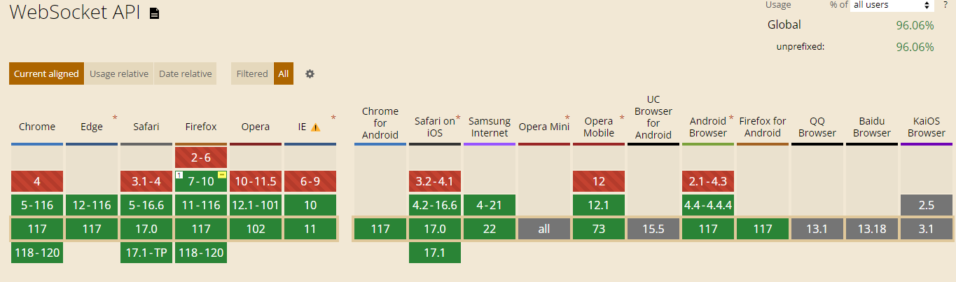 - 초록색과 회색 같은 경우에는 WebSocket 프로토콜을 지원하는 브라우저 버전이고, 빨간색 같은 경우 WebSocket 프로토콜을 제공하지 않는다. 그러므로 엄청 옛날 컴퓨터일 경우에는 주의할 필요가 있다.